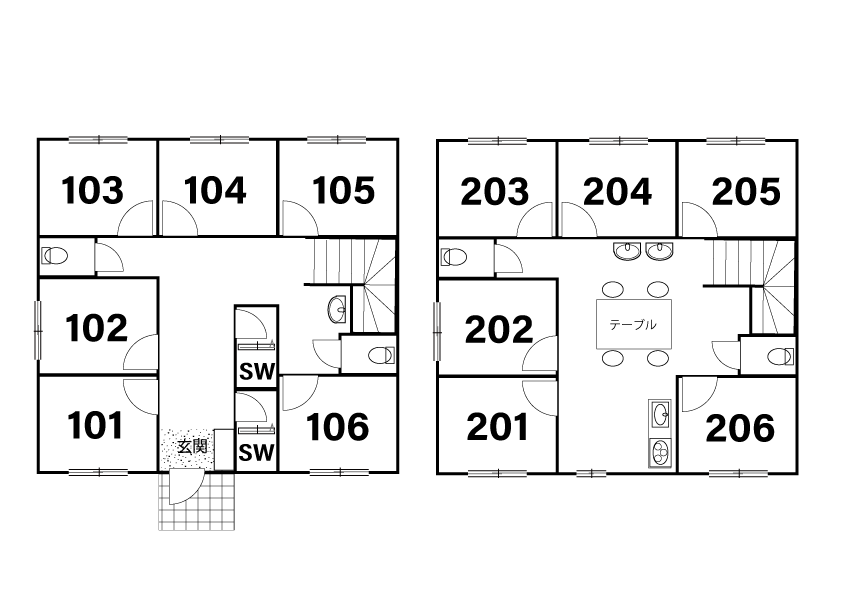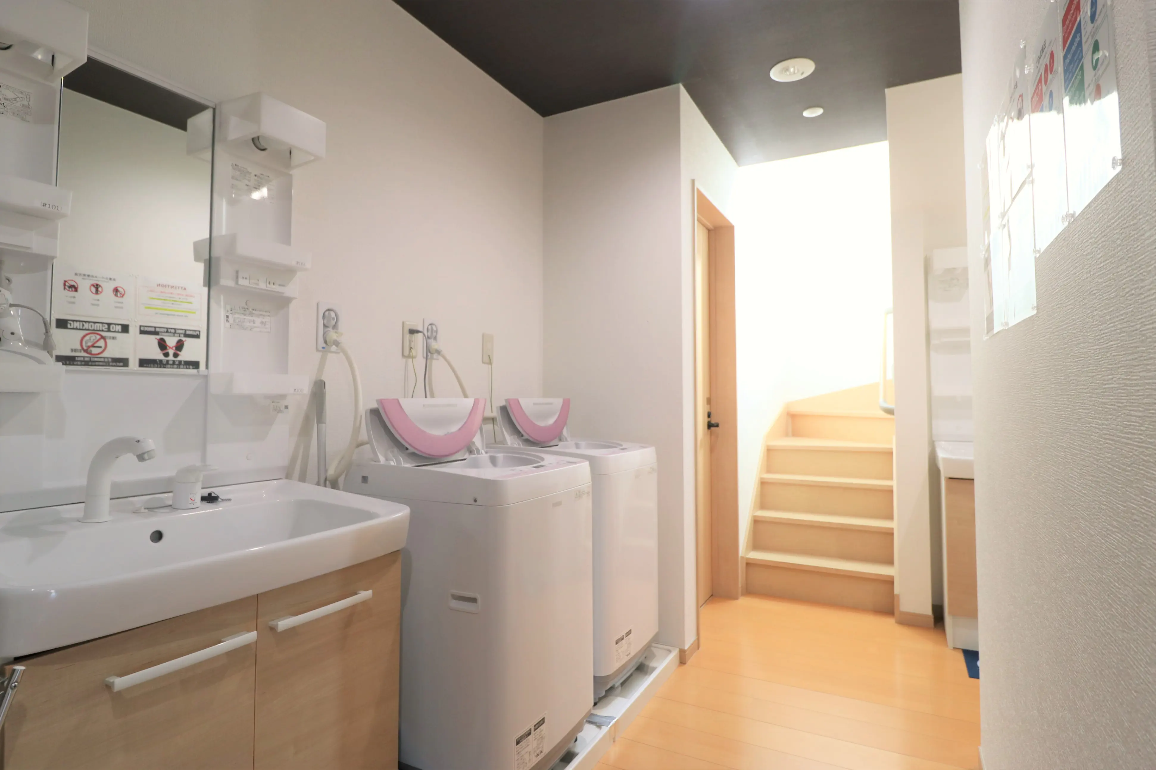 【築浅物件】専門スタッフが週に最低1回、共用部分を清掃します。 シェアハウスですので、個室スペース以外は全て共用です。キッチン、洗濯機、シャワー、Wi-Fi等はご自由にお使いください。全て無料です。 全12部屋の2階建て。全室鍵付き個室&プライベートをきちんと守れます。2階にはリビングがあります。